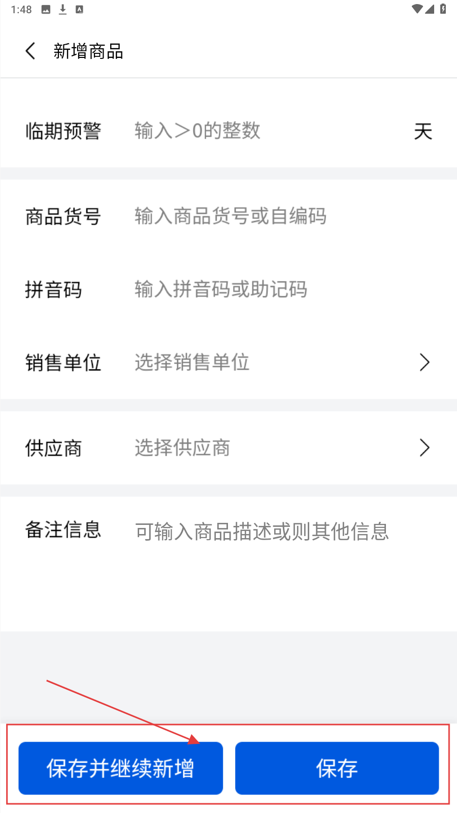3、填完信息,点【保存】或【保存并继续新增】,完成商品资料录入。