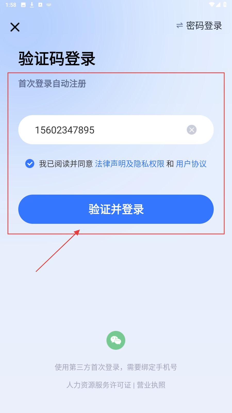 2、若应聘,进入【验证码登录】页,填手机号,勾选协议,点【验证并登录】。