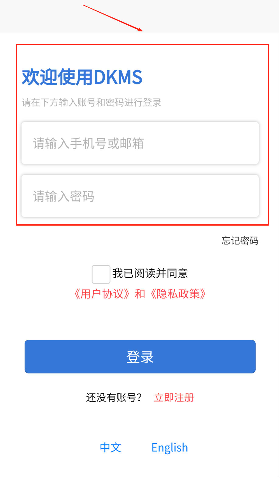 1、登录很简单呢,打开DKMS后输入手机号或邮箱,再填写密码,勾选同意用户协议和隐私政策,点击登录按钮就能进入系统了。