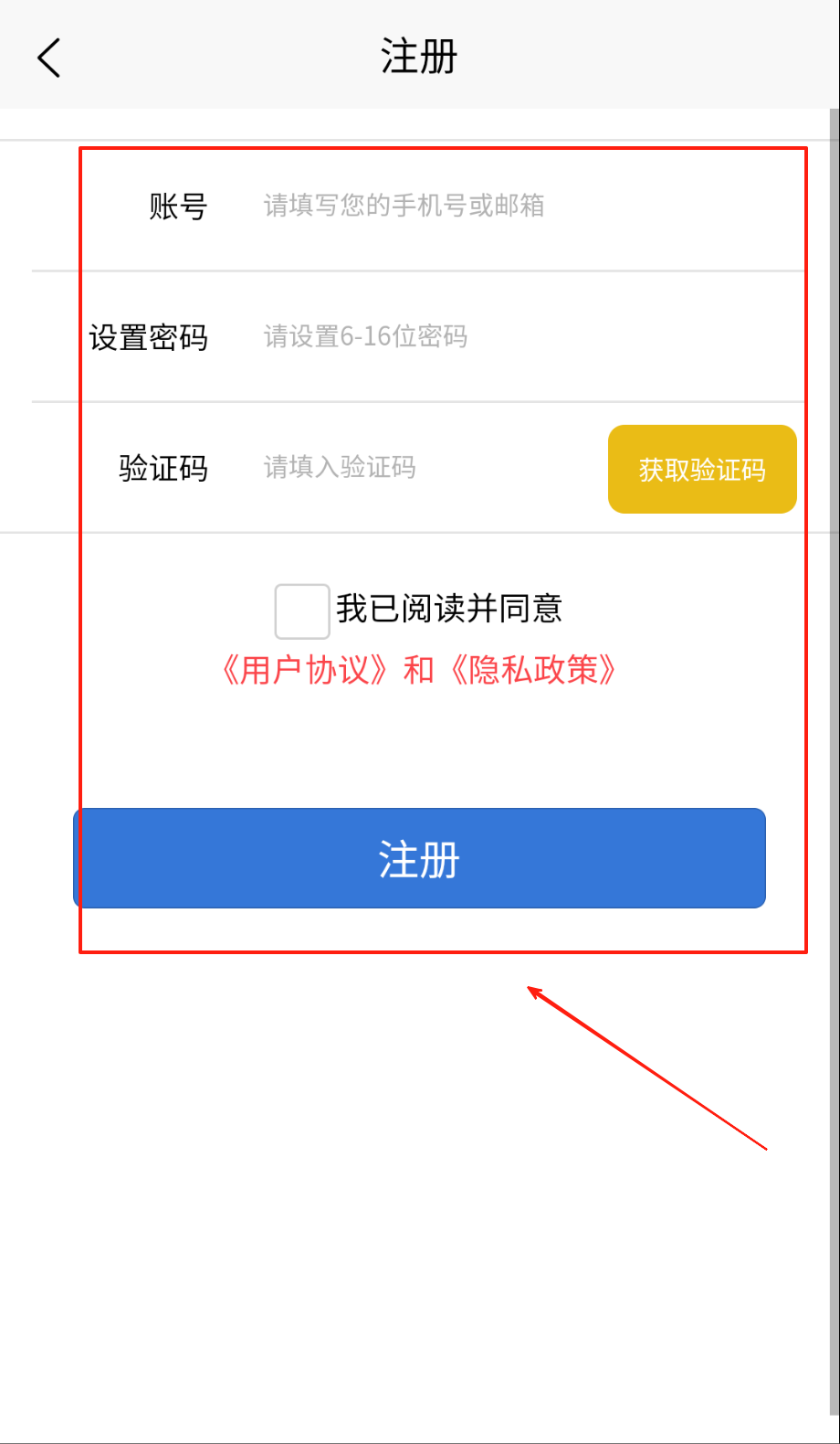 2、注册账号的话,先填写手机号或邮箱,设置6-16位密码,输入收到的验证码,同意协议后点击注册,轻松搞定呢。