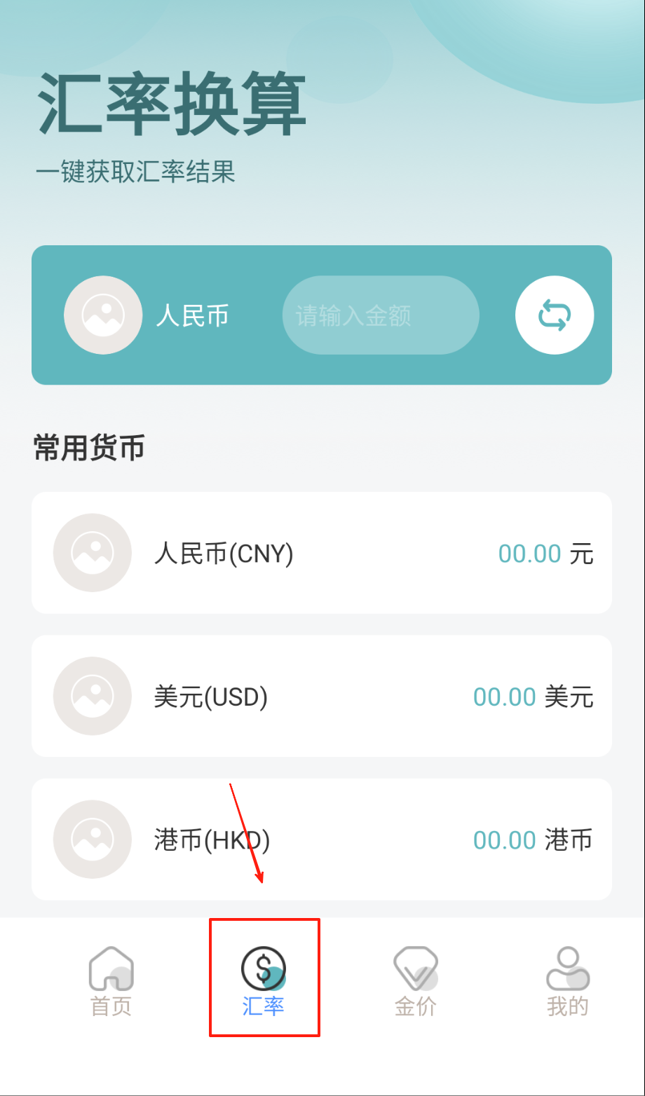 2、进入“汇率计算”界面,输入金额并选择货币类型,系统自动换算各国货币兑换结果。