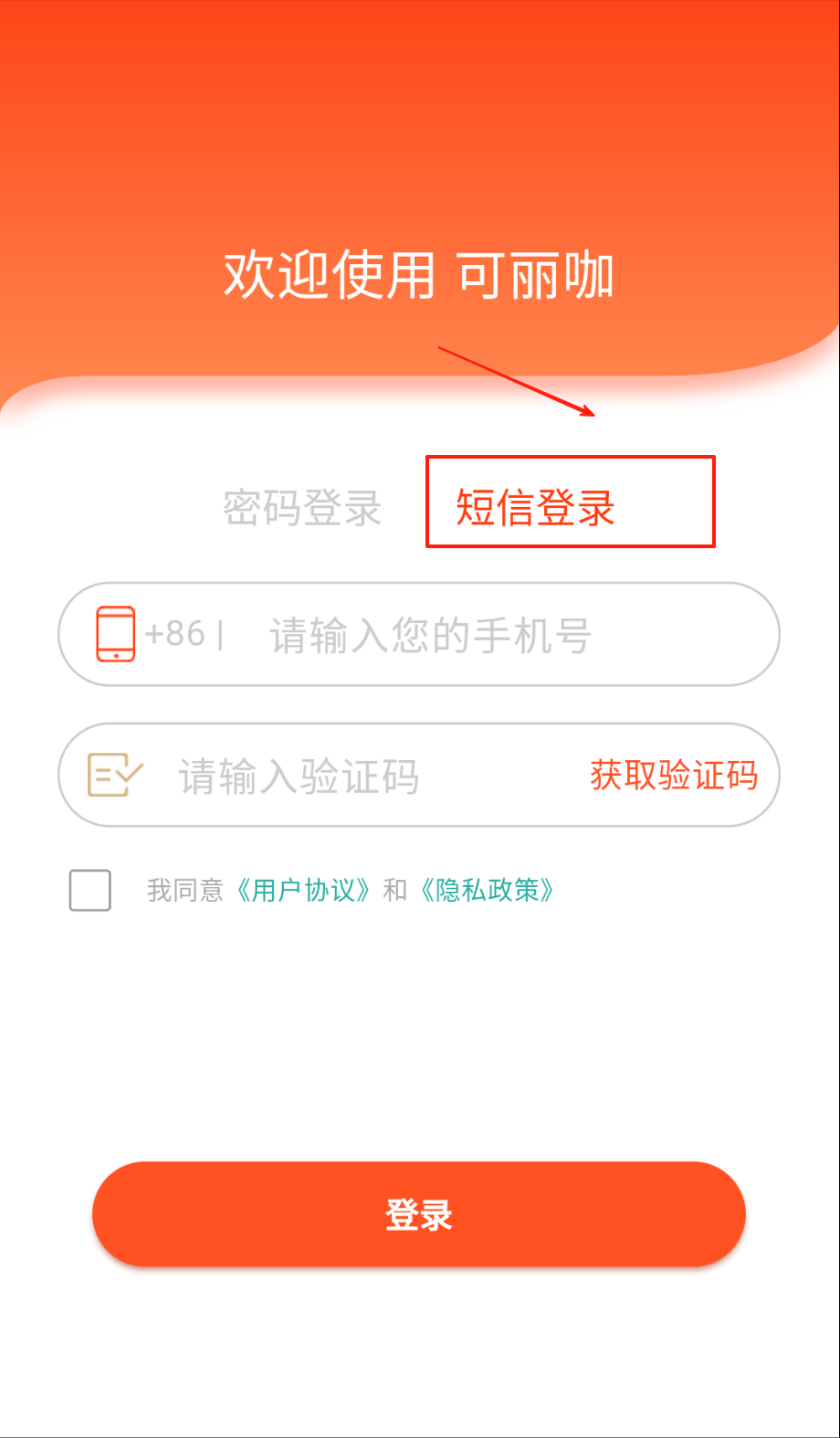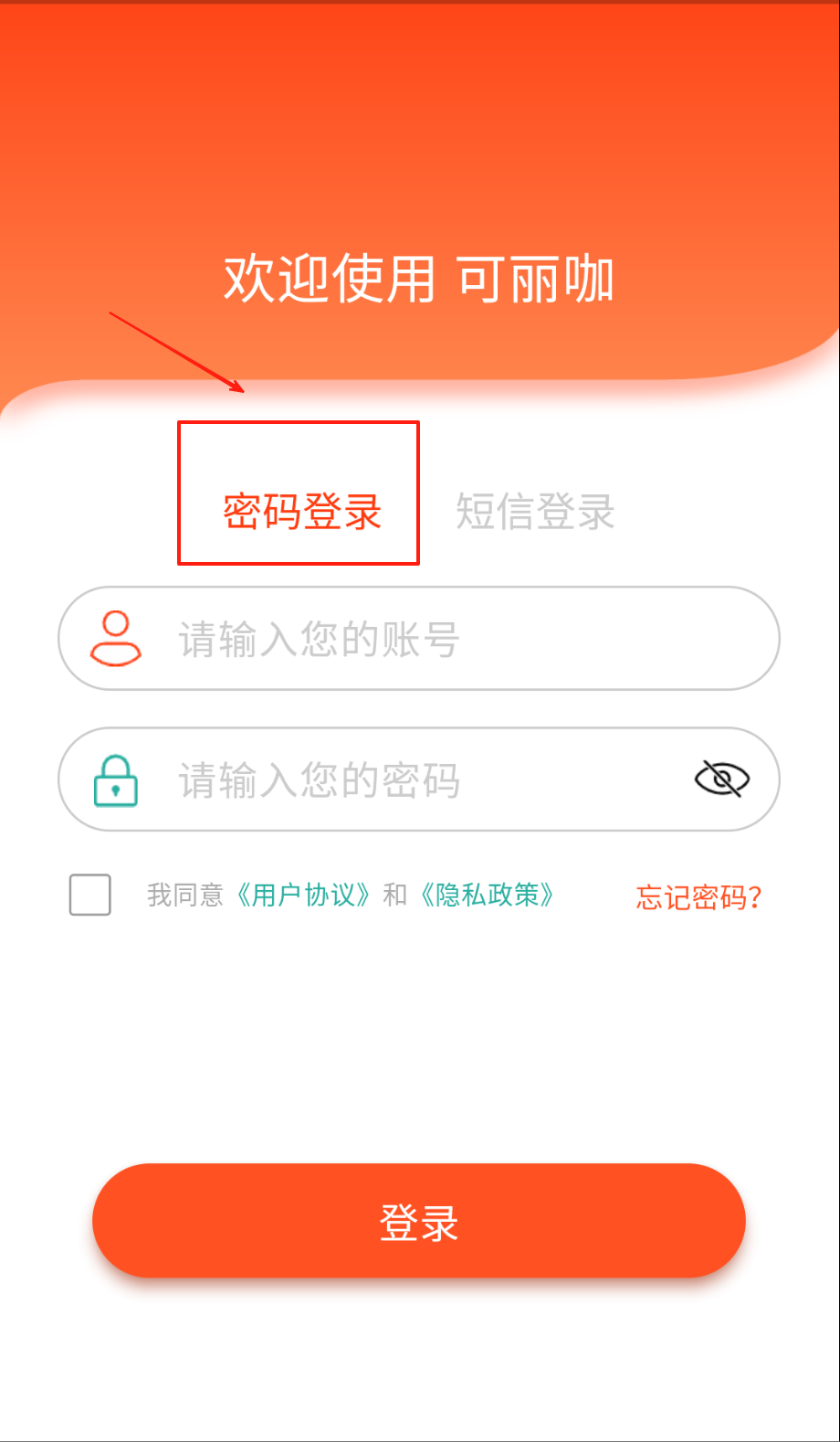 1、打开可丽咖后选择密码登录方式,输入注册时绑定的账号和密码,勾选同意用户协议和隐私政策,点击登录按钮即可进入主界面呢。