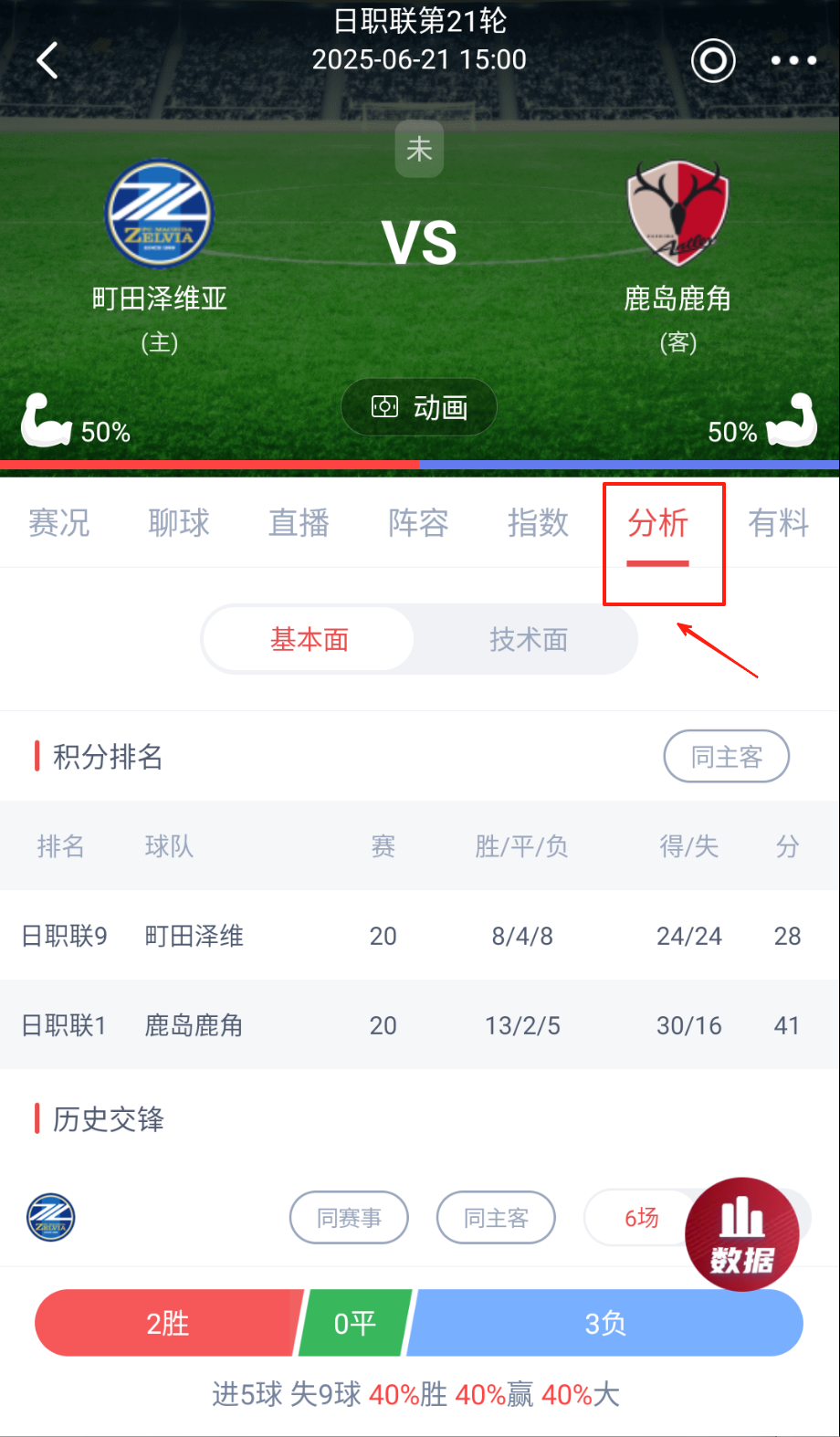 2、在数据板块,可以查看球队历史交锋记录、球员技术统计与战术板分析。