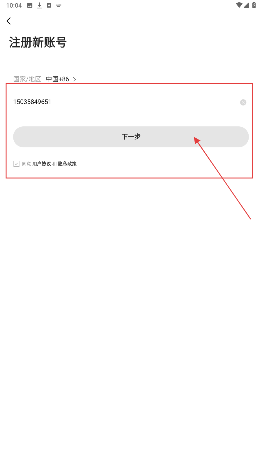 2、在注册新账号页,填手机号,勾选协议,点【下一步】。