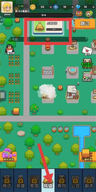 1、游戏主界面,点击底部“城镇”选项,进入城镇界面。留意屏幕上方的资源数值(如金币、钻石等)和关卡信息(第1关)。