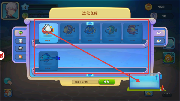 2、在进化仓库中,查看不同种类的鱼,通过相关操作(可能是培育、进化)管理鱼类。注意仓库容量(0/25),适时点击“升级”扩展容量。