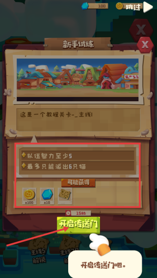 1、在“新手试炼”关卡界面,明确任务要求:队伍智力至少5,最多派出6只猫。了解可能获得的奖励,点击“开启传送门”进入准备界面。