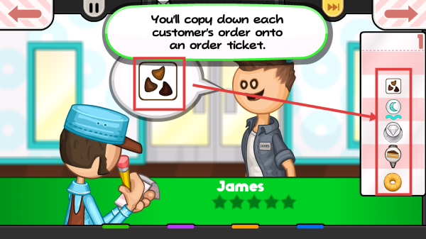 1、游戏开始,顾客James提出需求,根据提示,留意顾客对话框中的图标(如巧克力图标),并在订单栏准确记录顾客点单内容。