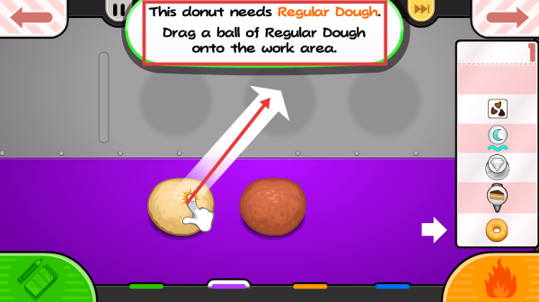 2、制作甜甜圈环节,看到提示,拖动普通面团到工作区,准备制作甜甜圈。