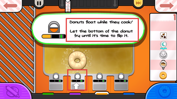 3、甜甜圈烹饪时,依据提示,观察底部烹饪进度条,待合适时机点击对应按钮翻面,确保甜甜圈烹饪完成,满足顾客订单需求。