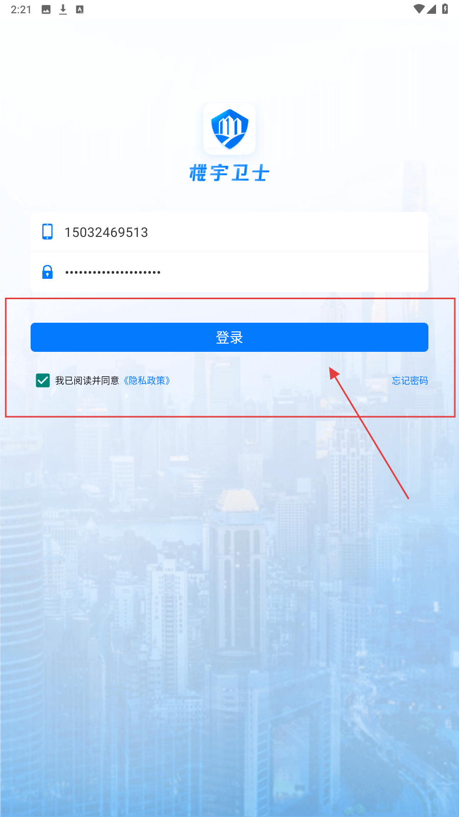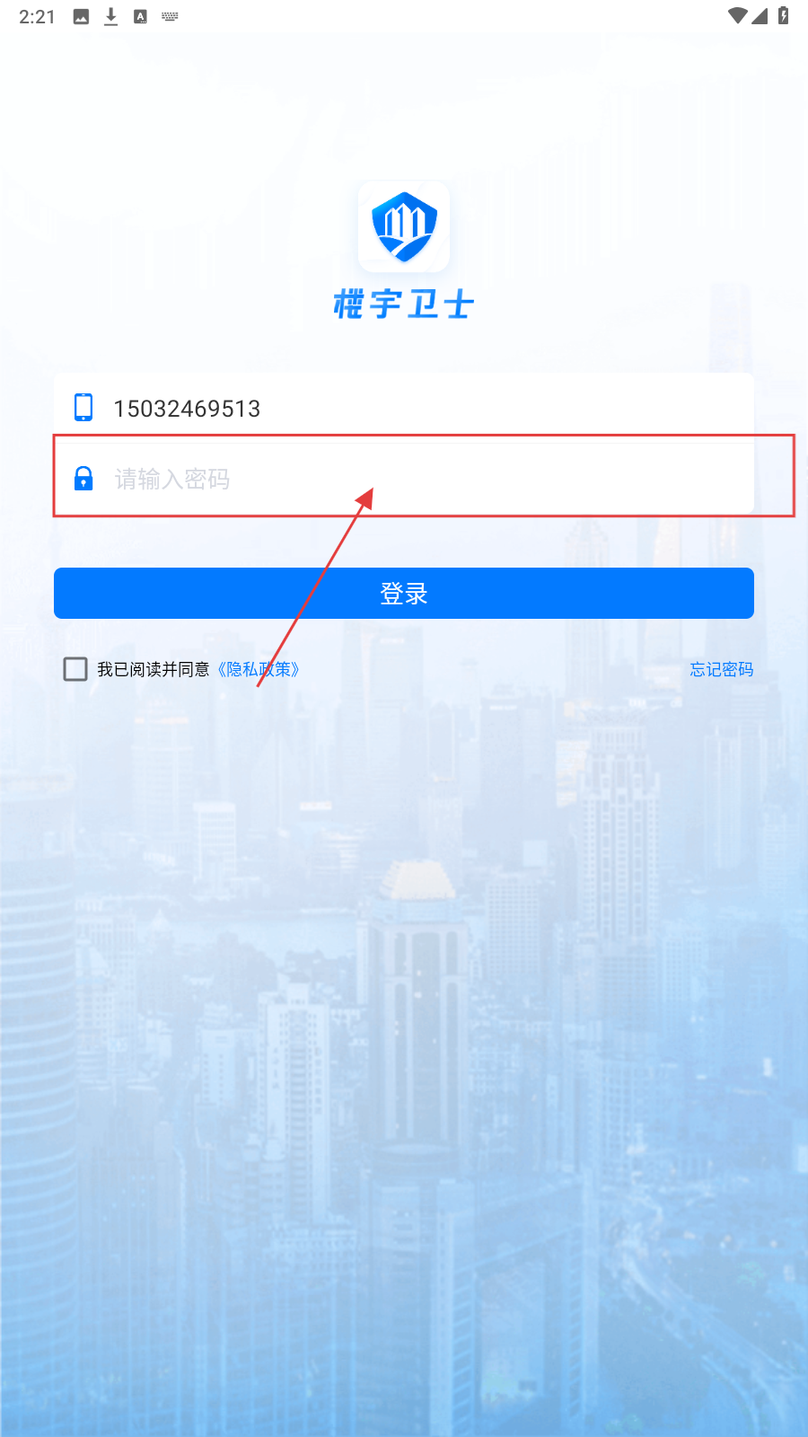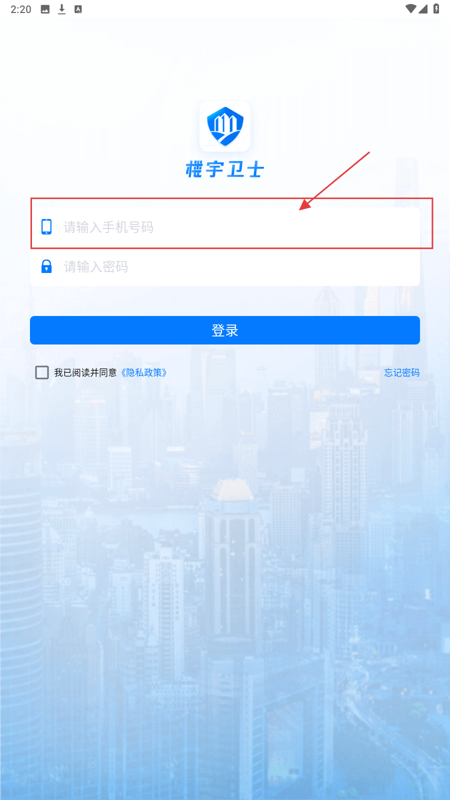 1、打开“楼宇卫士”应用,在【登录】页,填写手机号码。