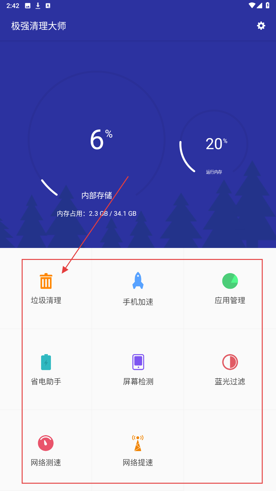 1、打开应用,页面显示内部存储占比、运行内存占比,还有垃圾清理、手机加速等功能,点击对应功能使用。