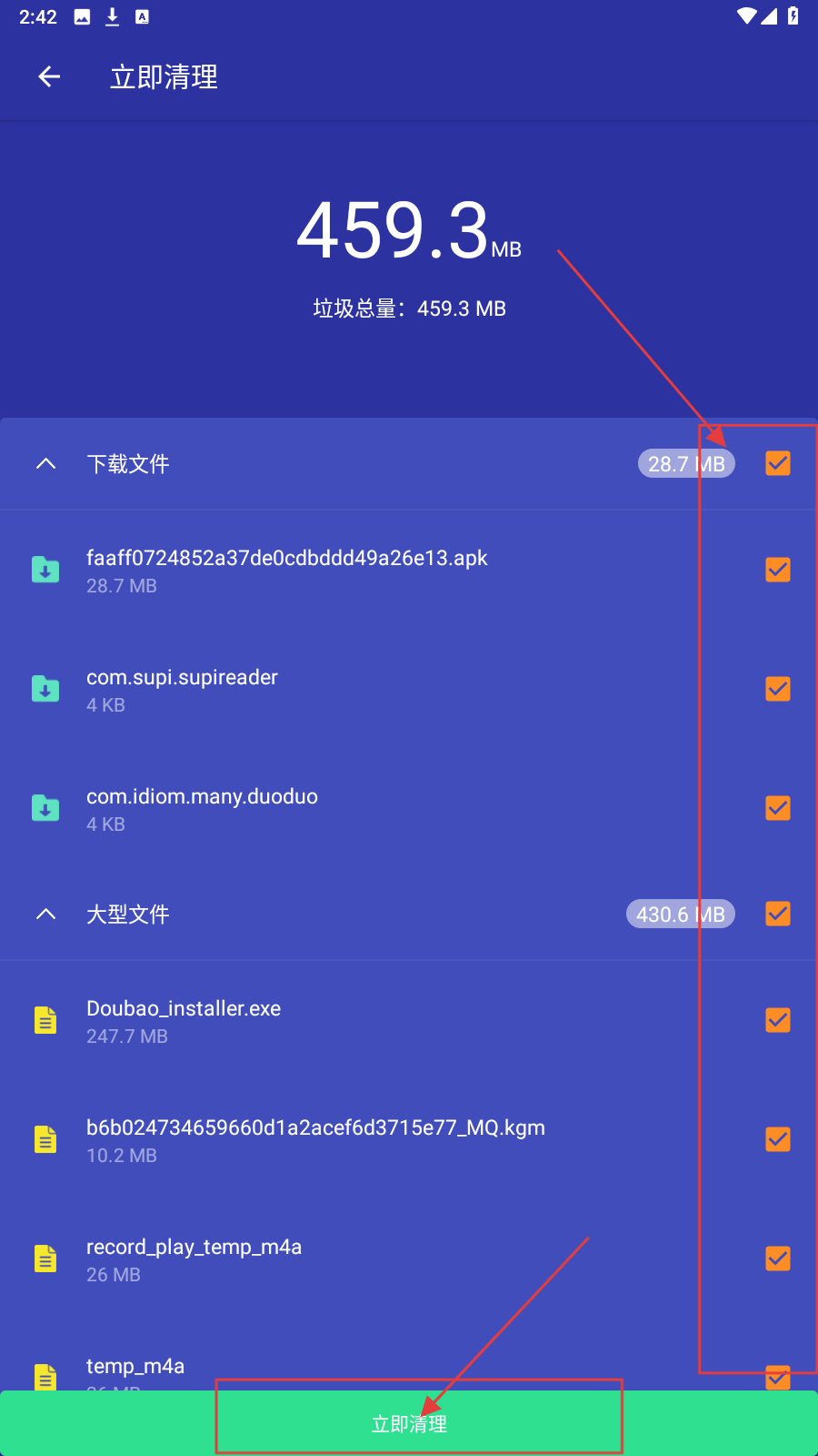 3、进入清理确认页,显示垃圾总量、已勾选文件,点击【立即清理】执行清理,完成后跳转完成页,点击【完成】结束流程。