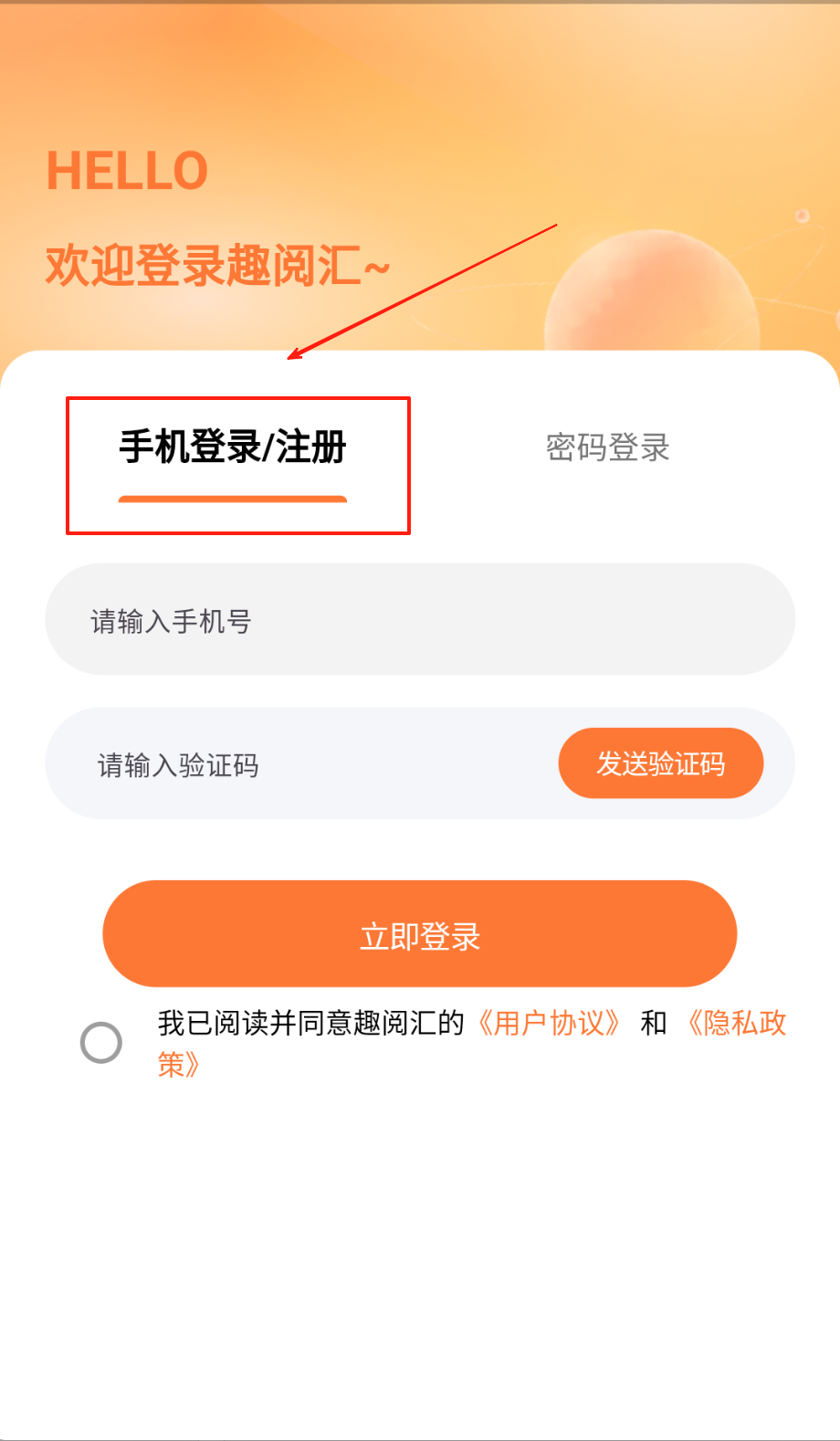 1、打开APP选"手机登录/注册"按钮,输手机号点"发送验证码",收短信填数字再勾协议框点立即登录呀。