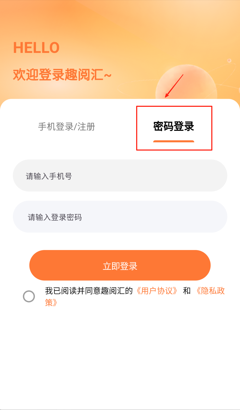 2、用密码登录就点"密码登录"选项,填手机号和对应密码,核对完勾协议框点蓝色登录按钮就行咯。