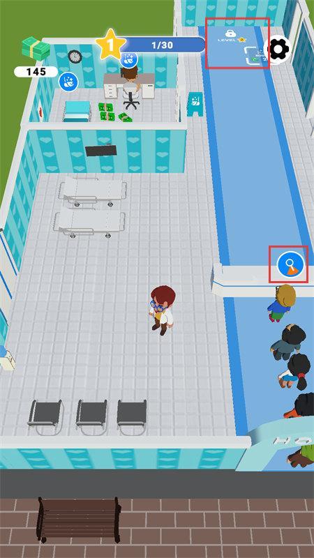 3、在诊室里治完患者,即可点击右下角的按钮,接待新的患者,获取更多经验和金钱,不断升级诊室设施。