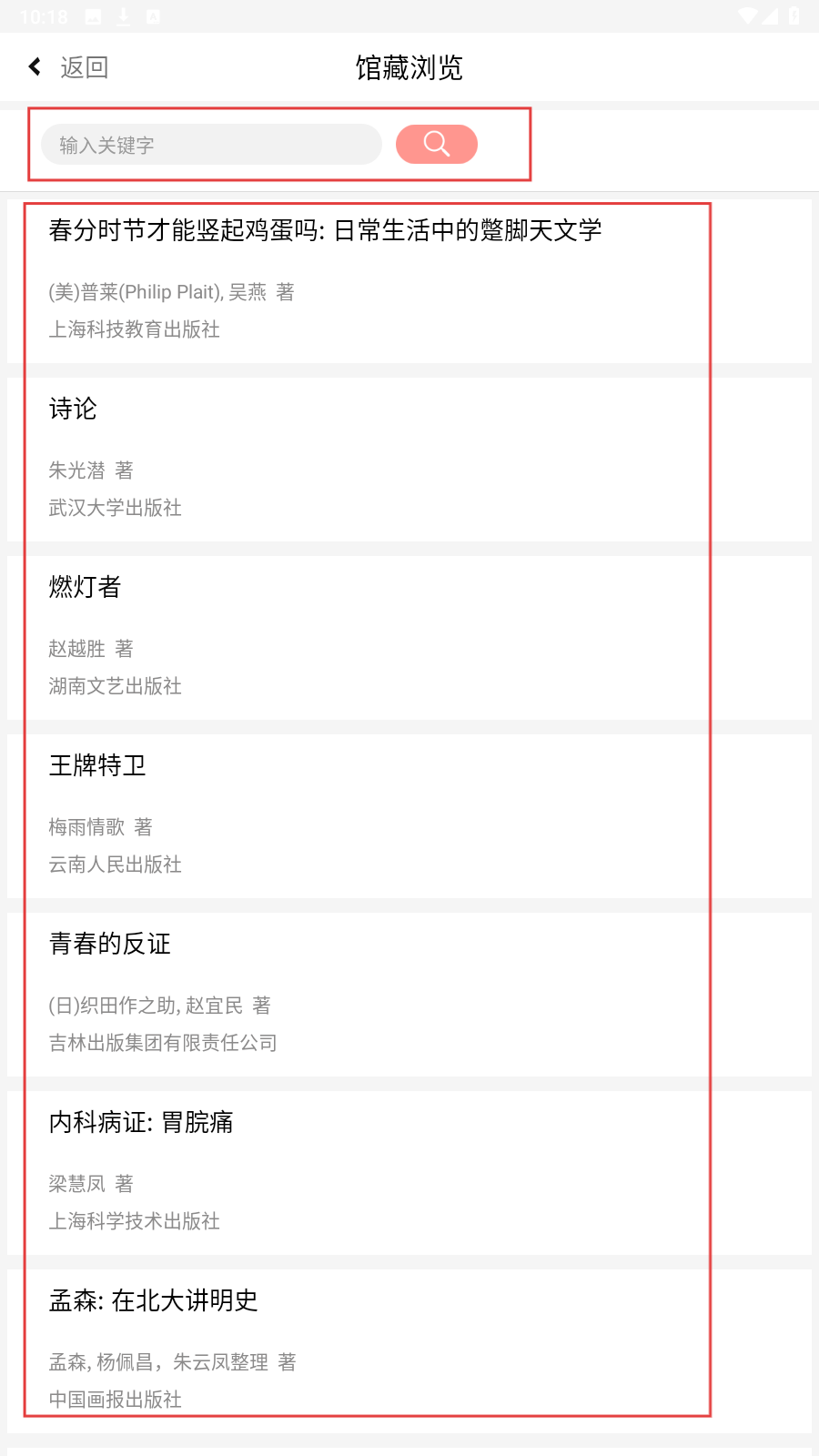 2、点击【馆藏浏览】,可以输入关键字搜索书籍(支持手动输入查找)。