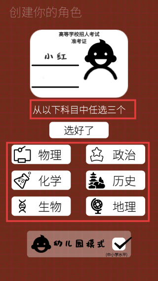 1、在【创建你的角色】环节,从【物理】【政治】【化学】【历史】【生物】【地理】中任选三个科目,选好后点击【选好了】。