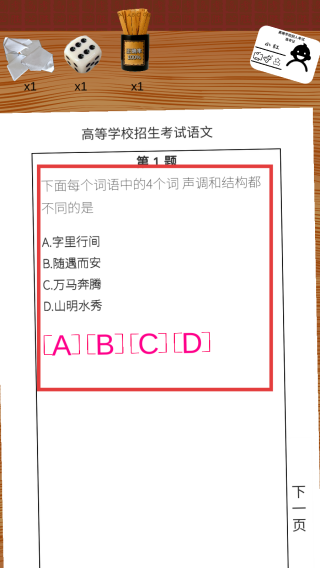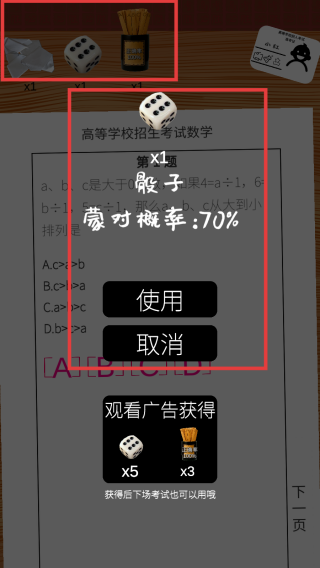 3、在【高等学校招生考试数学】第x1题中,若对题目答案不确定,可考虑使用【骰子】道具,其【蒙对概率:70%】,也可选择【取消】。