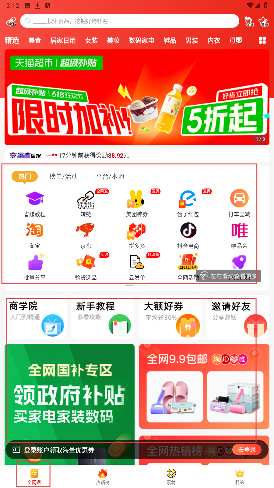 1、打开应用,在【全网返】页,浏览省赚教程、转链等功能,点击“热销榜”进入商品榜单页。