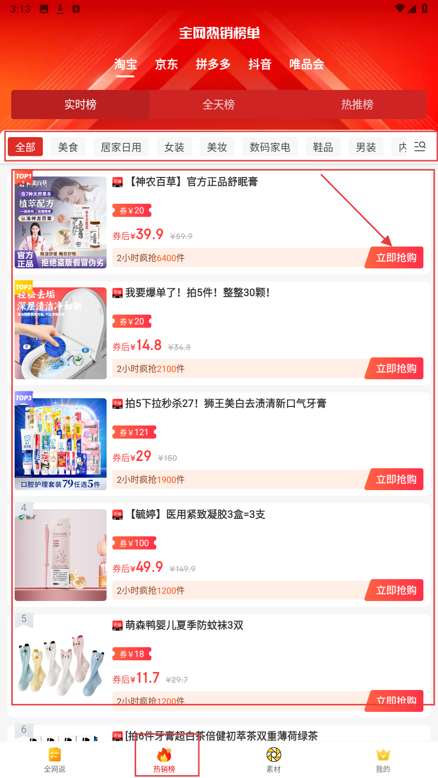 2、在【热销榜】页,切换淘宝、京东等平台榜单,选择心仪商品,点击“立即抢购”进详情。