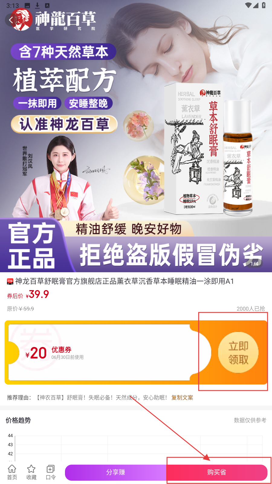 3、在商品详情页,领取优惠券,点击“购买省”完成下单,或分享赚佣金,完成购物/推广流程。