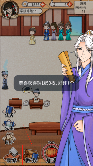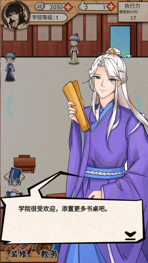 1、开始游戏:点击“开始游戏”按钮进入游戏,开始你的古代书院经营之旅。