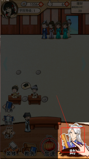 3、查看收入与加速:点击书院管理者角色,查看当前收入并使用加速功能快速增加收益。
