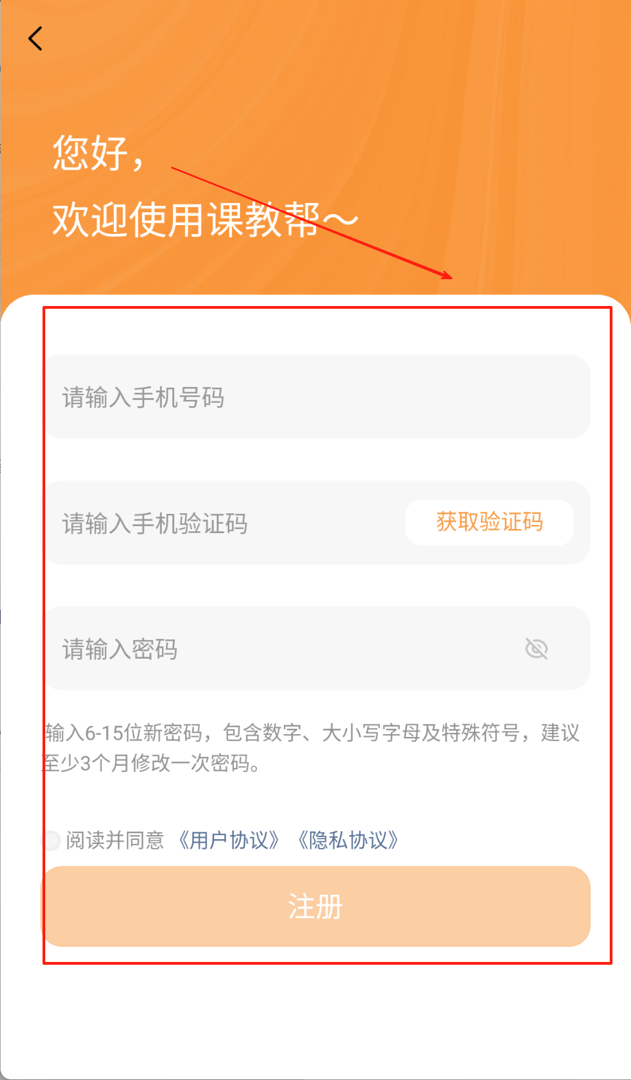 1、打开APP看到橙色欢迎页,输入框填好手机号别输错,密码栏注意字母大小写呀,勾选用户协议小框再点橙色登录按钮就进去啦。
