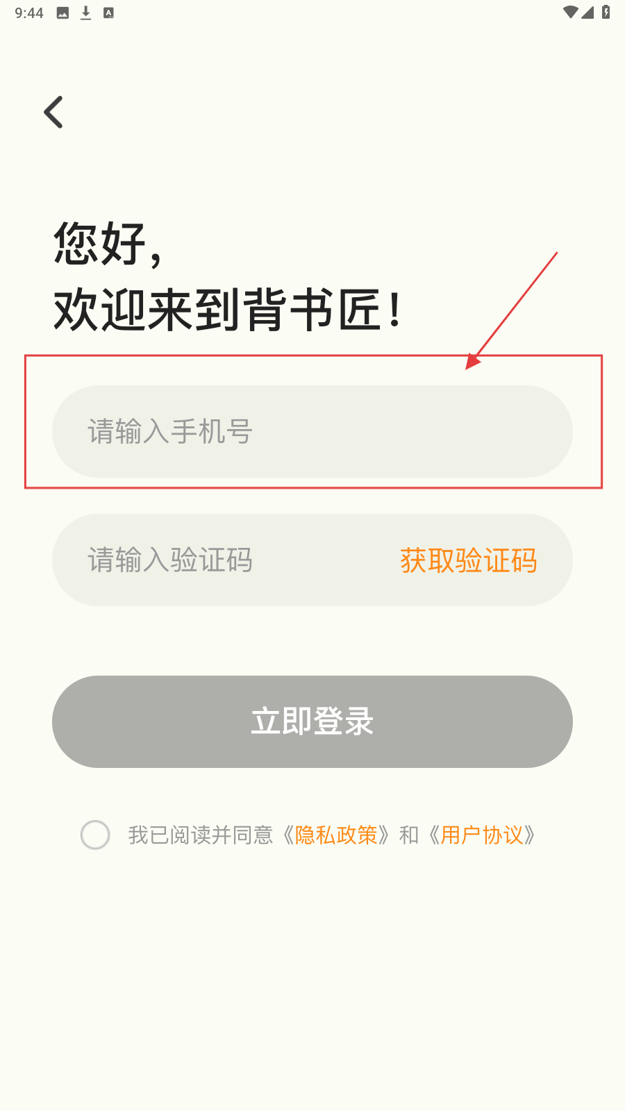 1、打开应用,进入登录页,在“请输入手机号”框内,录入手机号码。