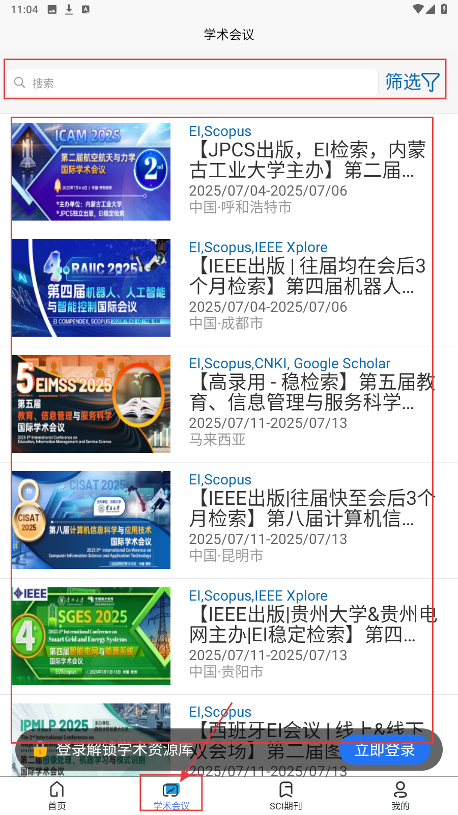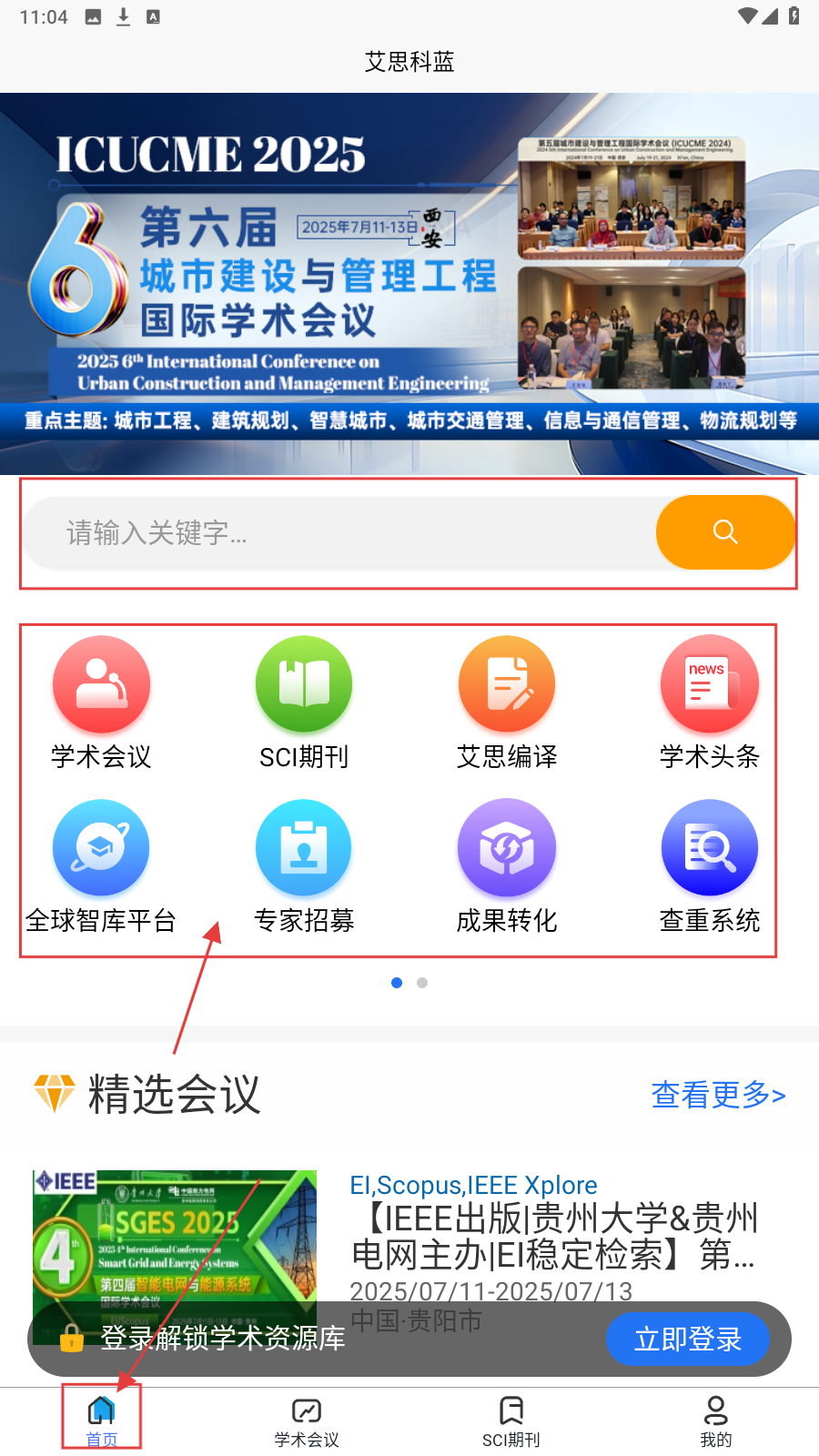 1、打开艾思科蓝应用,进入【首页】,查看搜索框及学术会议、SCI期刊等功能入口,点击对应模块(如学术会议、SCI期刊)进入。