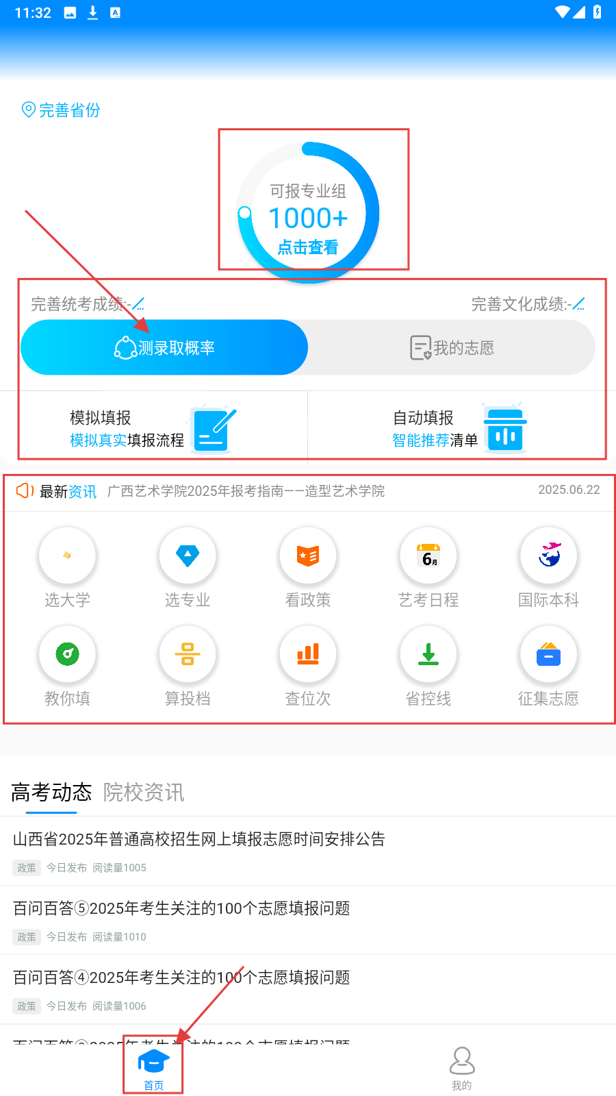 1、打开应用,进入【首页】,查看可报专业组、测录取概率等功能,点击对应模块浏览信息。