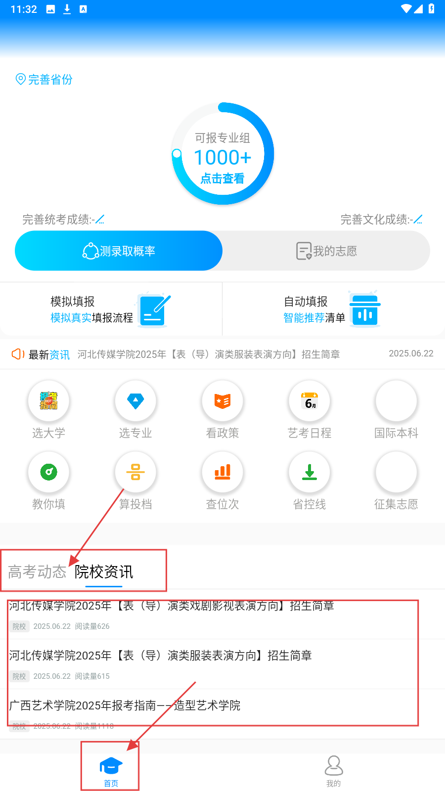 2、往下滑动还有高考动态、院校资讯可以进行查看。