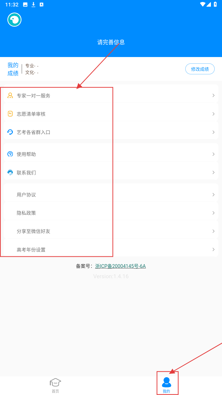 3、切换至【我的】页面,查看专家一对一服务、志愿清单审核等功能入口,按需点击使用服务。