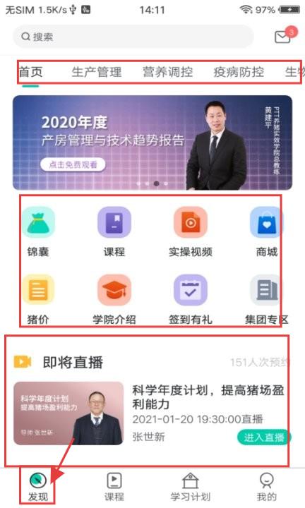 1、打开应用,进入【发现】页,查看顶部导航栏、中间功能图标、即将直播板块,点击对应内容浏览学习。