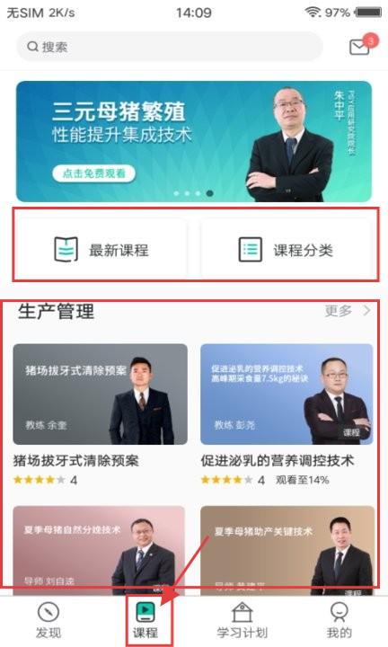 2、切换至【课程】页,查看最新课程、课程分类及生产管理课程列表,选择课程(如猪场拔牙式清除预案等)进入学习。