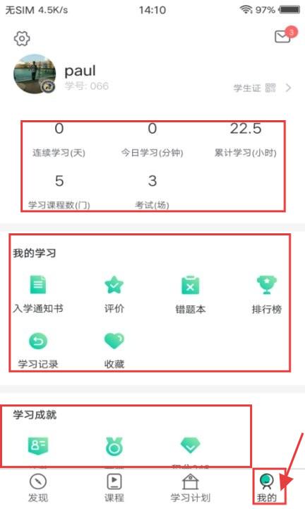 3、进入【我的】页面,查看学习数据、我的学习功能、学习成就板块,按需使用功能,推进学习管理流程。