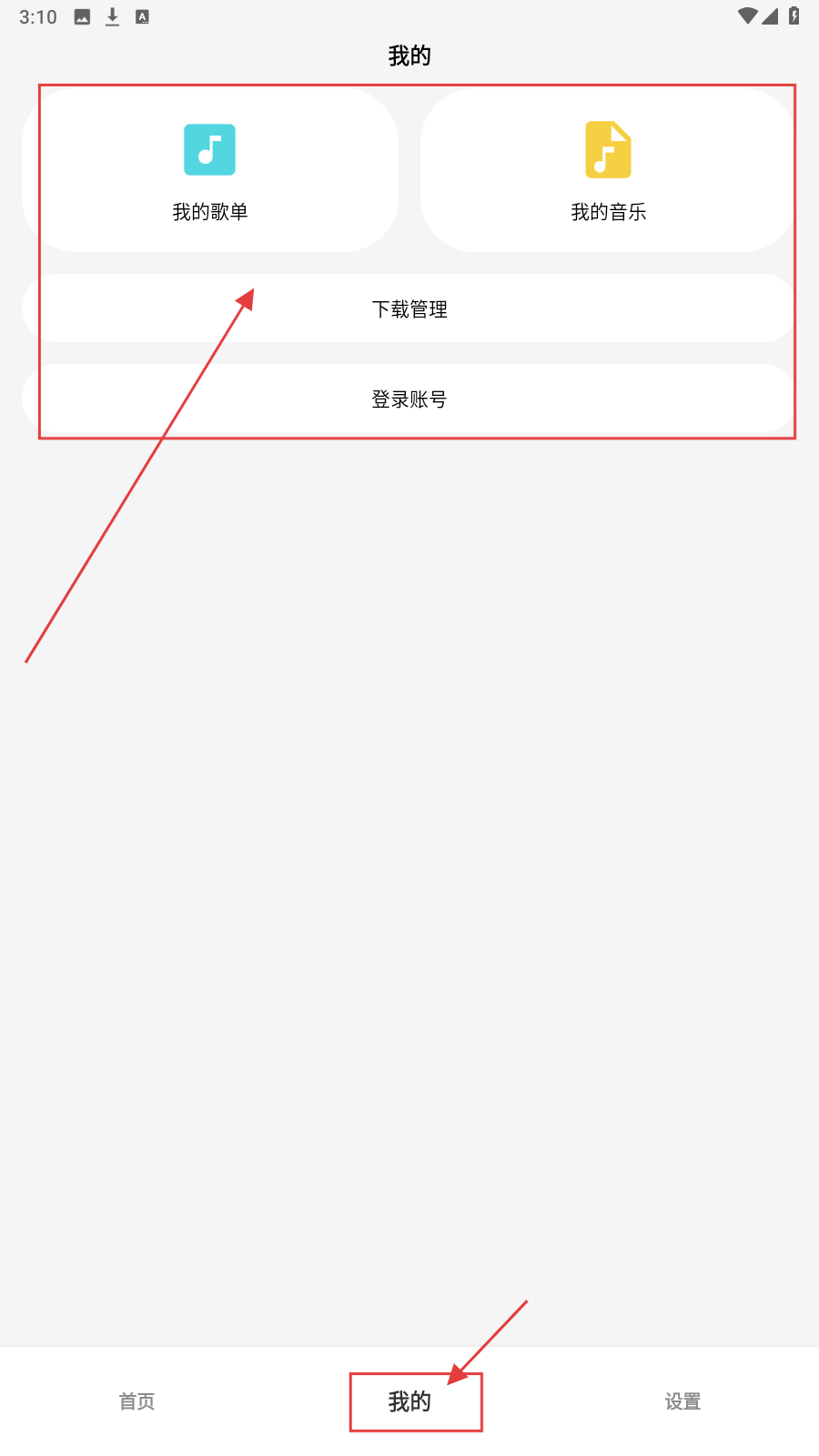 2、切换至【我的】页,查看我的歌单、我的音乐、下载管理、登录账号,可操作(如进入我的歌单)。