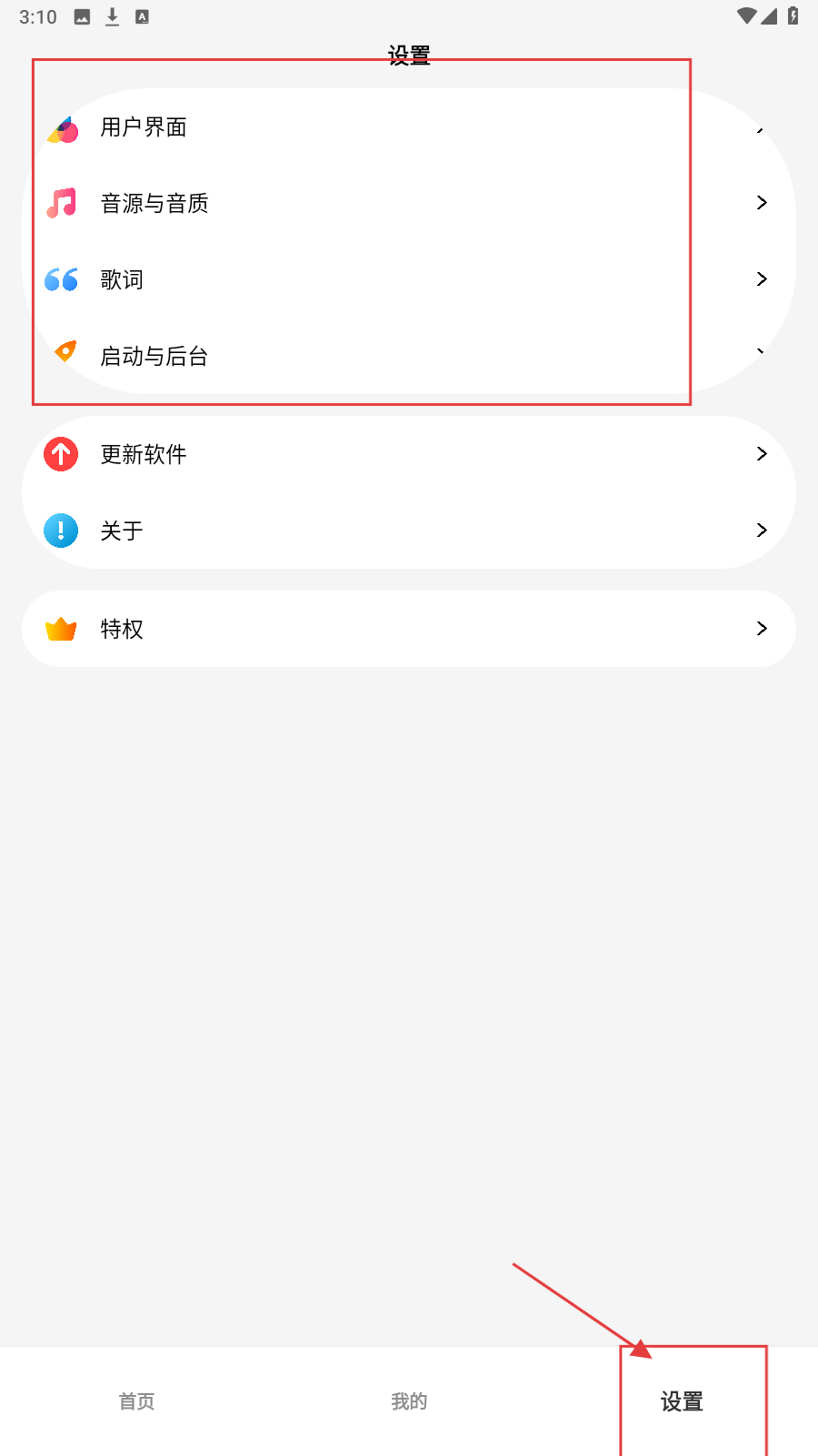 3、进入【设置】页,查看用户界面、音源与音质、歌词等设置项,点击对应项(如音源与音质)调整,完成应用探索流程。