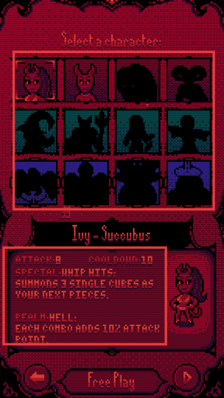 1、角色选择界面,可根据喜好或角色属性选角,如Ivy-Succubus,其攻击8、冷却10,技能可召唤方块,在地狱领域连击能加攻击输出。