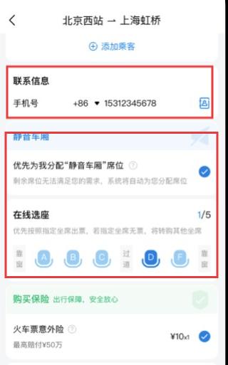 1、进入购票页,可见行程“北京西站→上海虹桥”,填写联系信息,选择“静音车厢”“在线选座”等服务,可买保险。