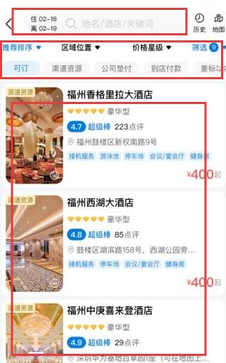 2、切换到酒店预订页,设置日期,浏览推荐酒店,查看价格、评分等信息。