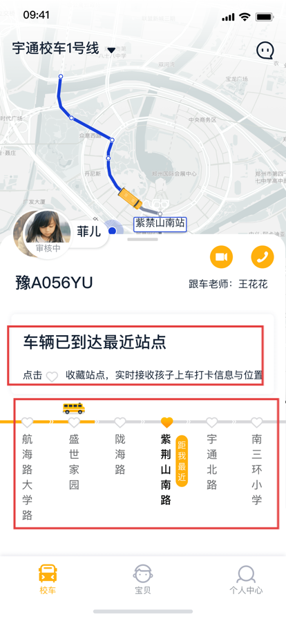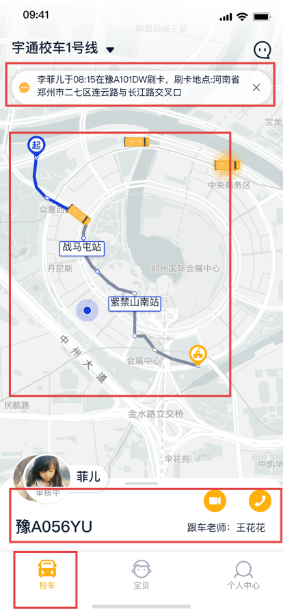 1、进入【校车】页面,查看宇通校车1号线轨迹、李菲儿刷卡信息,车辆信息。