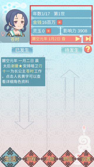 2、进入游戏,关注资源和影响力数值。金钱用于购买物品等,灵玉可能有特殊用途,影响力或影响剧情走向和社交。