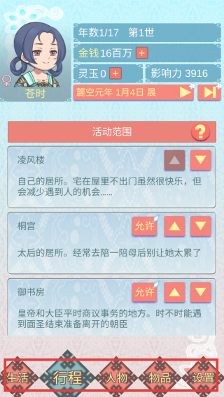 3、利用“生活”“行程”等功能按钮规划角色活动。在凌风楼休息或触发事件,去桐宫陪伴太后增加好感,御书房接触朝臣拓展人脉。