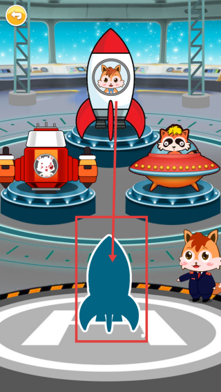 2、在宇航员相关场景,按指示拖动飞船到对应位置。也可拖动宇航服部件为小动物宇航员穿戴,完成装扮任务,锻炼动手能力和观察力。