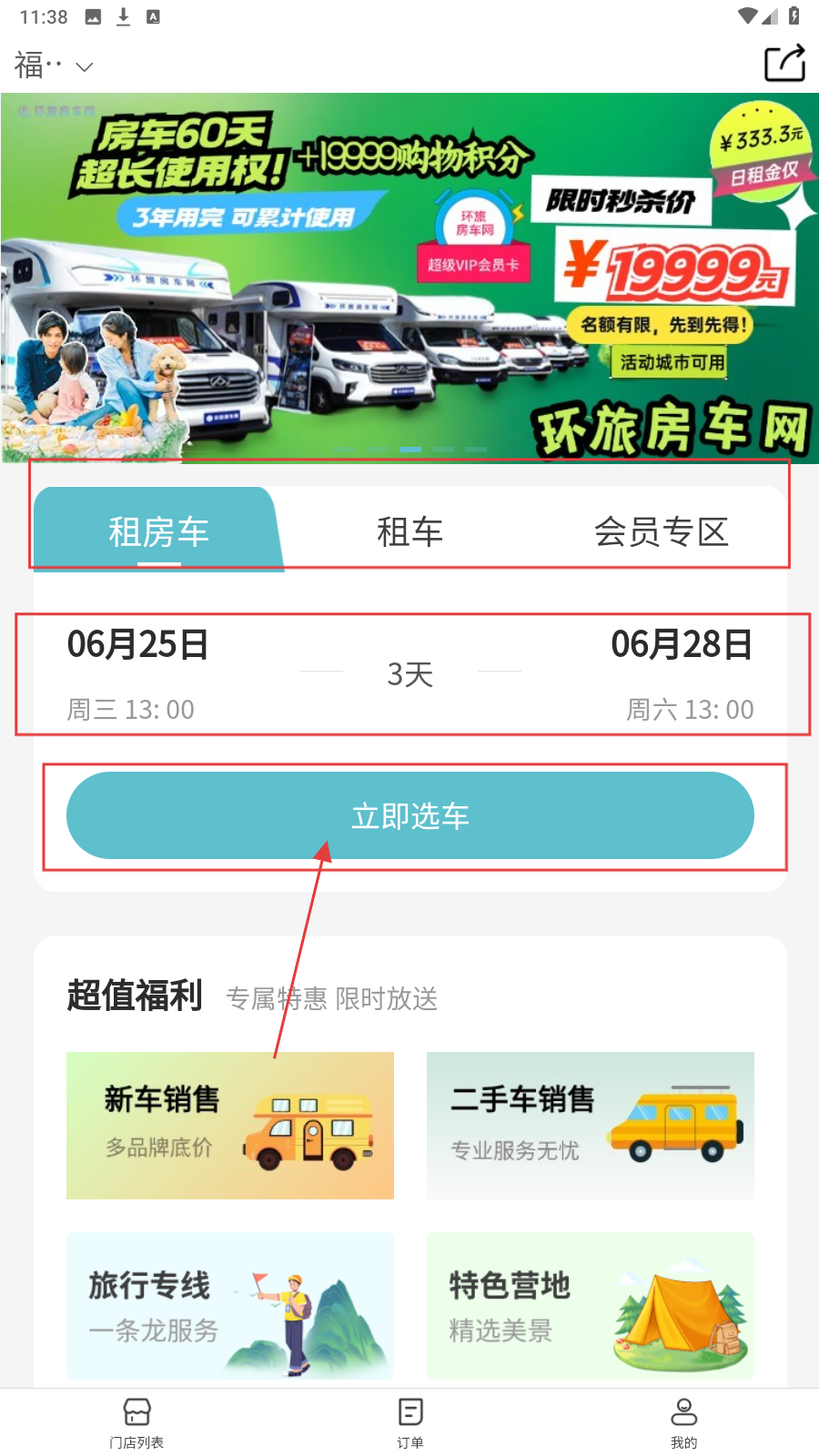 1、打开“环旅房车”APP,选【租房车】,设置日期,点【立即选车】。