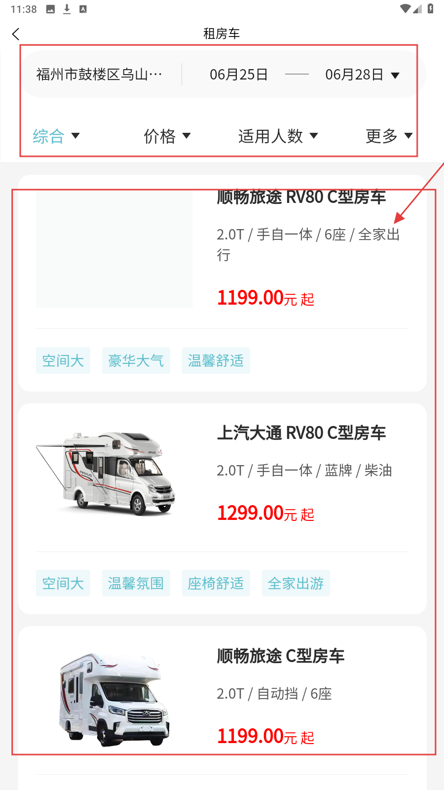 3、在租房车页,浏览车型(如顺畅旅途RV80C型房车等),完成房车租赁选车流程。