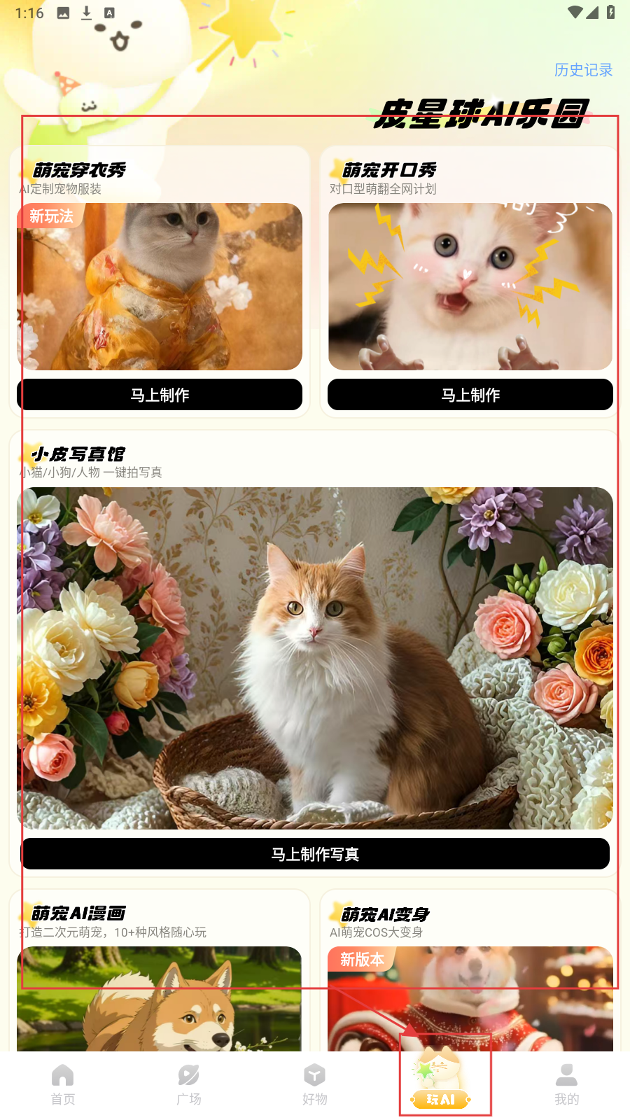 3、进入【玩AI】页,打开“皮星球AI乐园”,有“萌宠穿衣秀、萌宠开口秀”等功能,可制作萌宠AI内容,完成APP功能体验流程。
