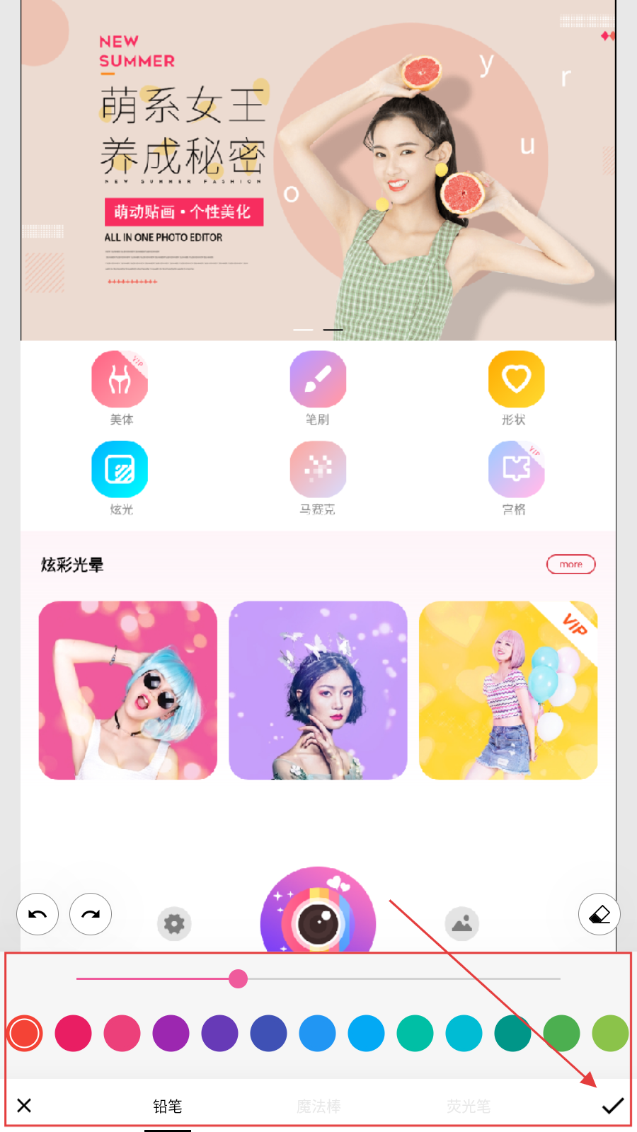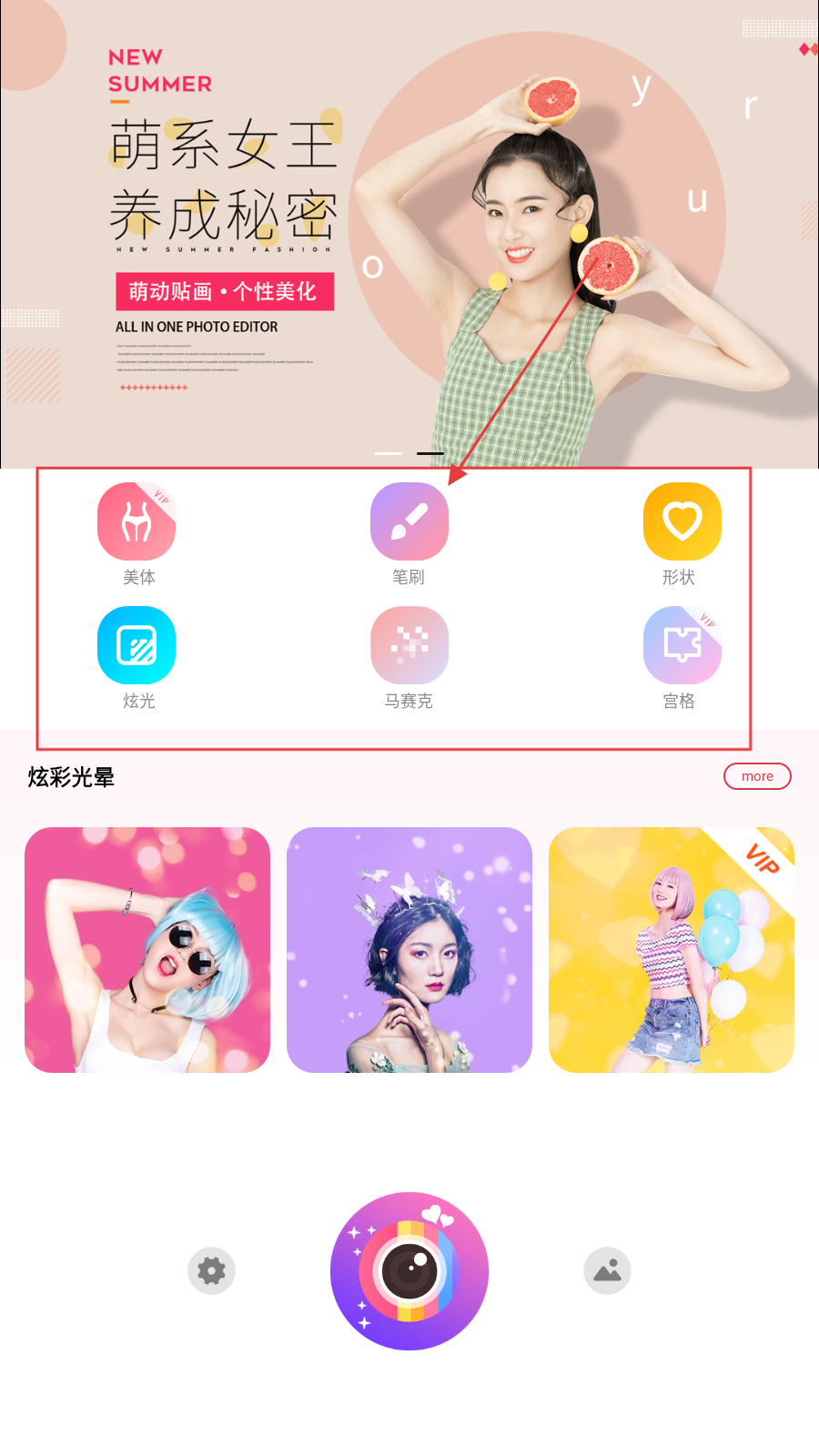 1、打开应用,进入美化界面,可见美体、笔刷等功能入口,点击【笔刷】进入编辑。